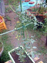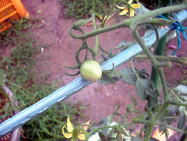 写真左は、8月29日の様子主茎が伸びてきたので支柱を立てました。実もつきましたが赤く色づくでしょうか? |