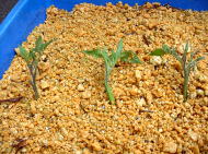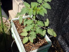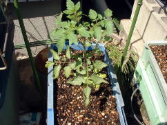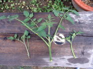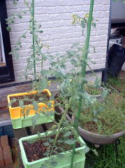 | シシトウが100円ショップのコンテナで順調に生育していたので、「これならミニトマトもできるかも」とミニトマトの栽培をやってみようと考えました。(6月中旬) しかし、この時期すでにホームセンターでもミニトマトの苗はなく、種から苗を育てるのも時間がかかるのでどうしたものかと悩んでいました。そこで、露地で栽培しているミニトマトのわき芽をつかい、挿し芽をして苗を確保することにしました。 |