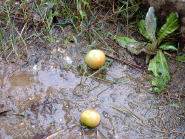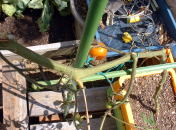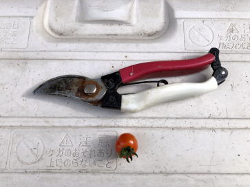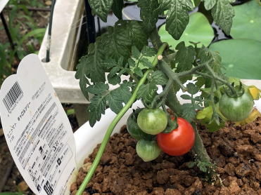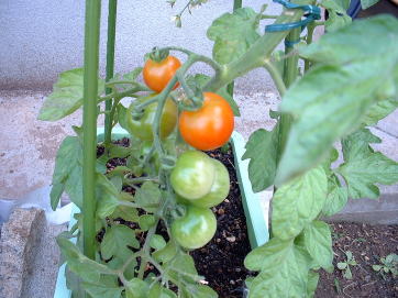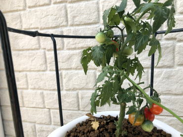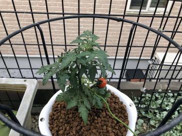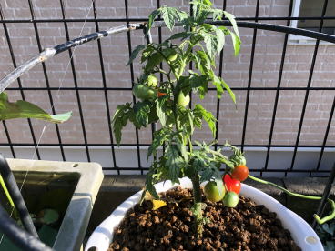 順調に成長していたミニトマトですが9月17日の台風13号で無惨な姿に。何とか一つだけ収穫することができました。(写真右端) |