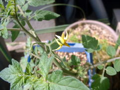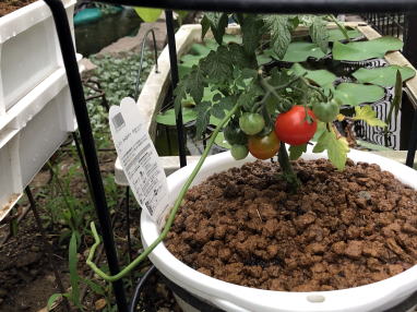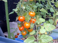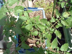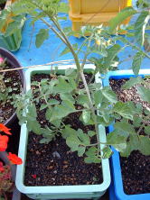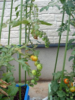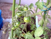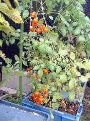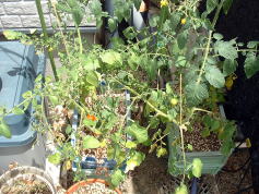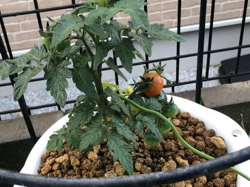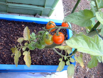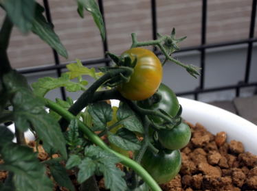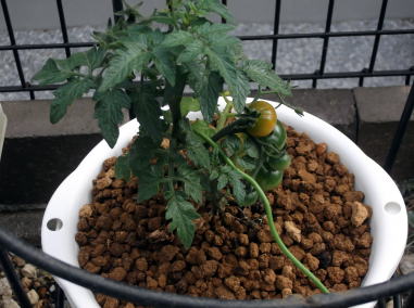 | 5月31日。トマトの実が色づき始めました。ザルから根が出ています(右)。もう少し茎が伸びるのかなと思いましたが伸びていません。コンパクトな品種なんだと改めて感じました。 | ||
