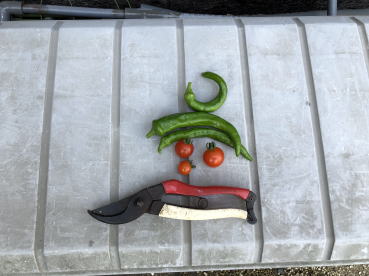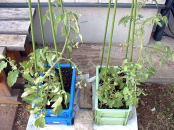 | 6月20日の様子。上右側画像は収穫したもの。ミニトマトの上は万願寺とうがらし。 最初に収穫してから20日までに、他に2個ほど収穫しています。 | ||