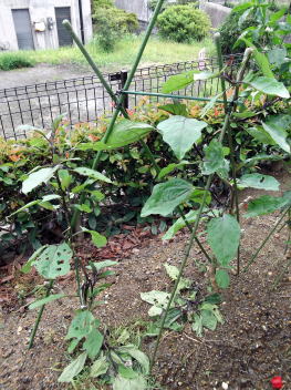 | 6月26日の様子です。雑草を取り除きました。現在見えているナスを収穫後、枝が混んでいる部分を少し整理しました。(枝を切りました) | ||