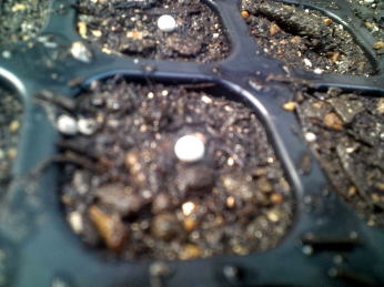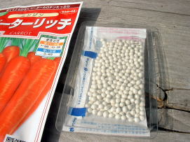 2月27日 今回は「コーティング種子」を使用することにしました。(ホームセンターで売っています) 種を筋蒔きにして、間引きをする方法よりも手間がかからないと思ったからです。 |