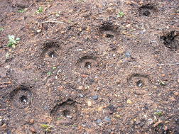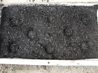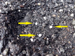 あらかじめニンジンを収穫する太さをイメージし種巻く場所を決めていきます。 3号鉢の底を使って種をまく場所用の跡をつけていきます。 ひとつの場所に2粒〜3粒種をまきました。 |
