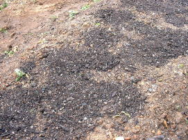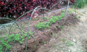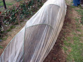 種をまいた後は、覆土をし水をまきました。 (種をまく前にも、しっかりと水撒きをし土に十分な水分を含ませました)左写真 今の時期の栽培にはトンネルが必要みたいなので、使い古したビニールをかけました。右写真 |