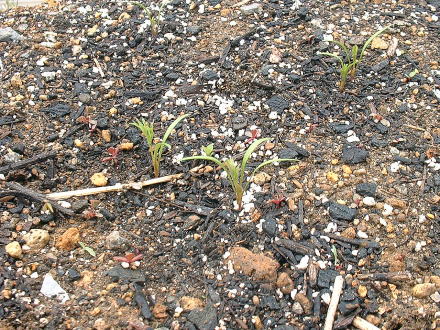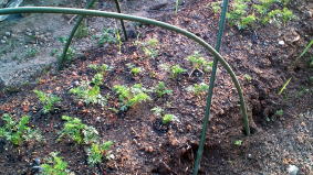 3月27日 気温が低いためか、種まき後4週間たってもこの大きさにしか成長しませんでした。 種まき後は、トンネルをかけていましたが思った以上に生育が悪いと感じました。 |