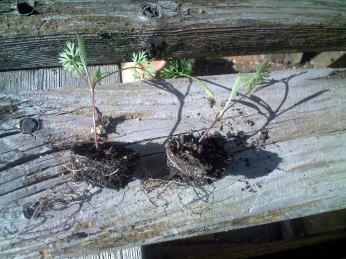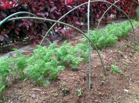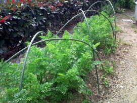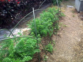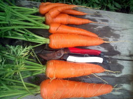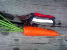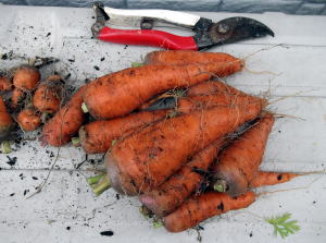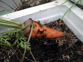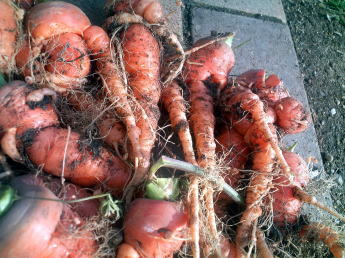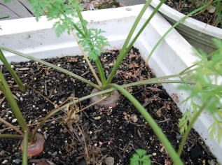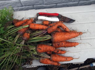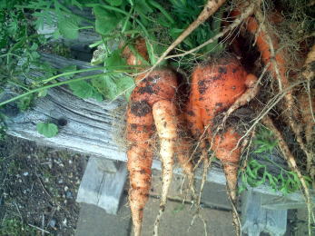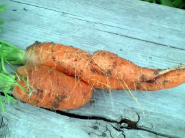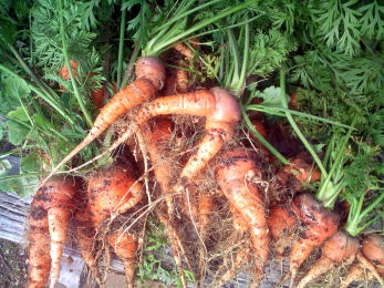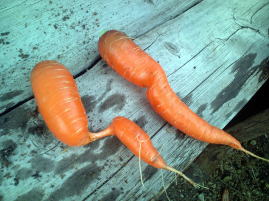 6月8日何本か収穫をしてみました。少し小さめですが、家庭で食べるには十分なサイズです。 左のニンジンは、2本が巻きついたように成育していました。面白いものです。 |