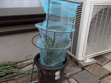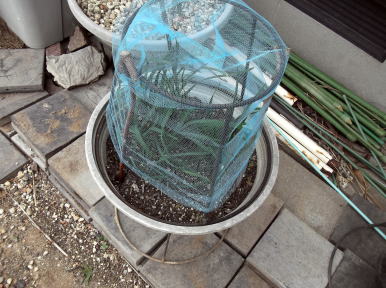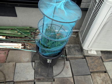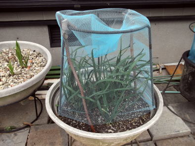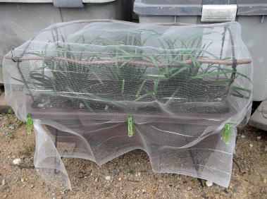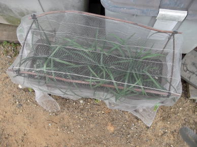 長方形のプランターには、上部の両端には、壊れたプランタースタンドを利用し、ネットをかぶせる枠を作りました。枠の上から100円ショップの防虫ネットをかぶせ洗濯ばさみでネットを固定。 |
