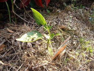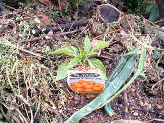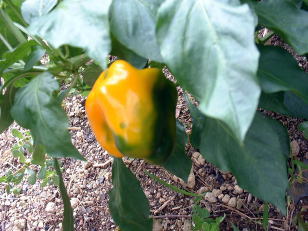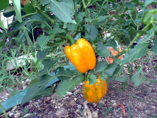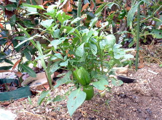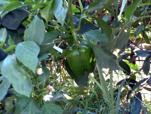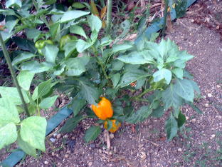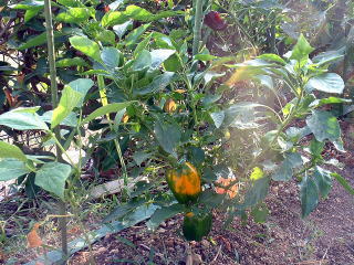 | 定植から3ヶ月たったても写真(上左)の様子なので、生育はかなり遅いと思いました。(ピーマンならもっと大きくなっている。)さらに、一月後になってやっとパプリカらしい色に変わり始めました。 | |||
