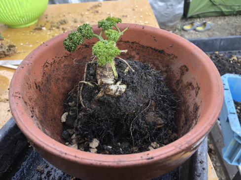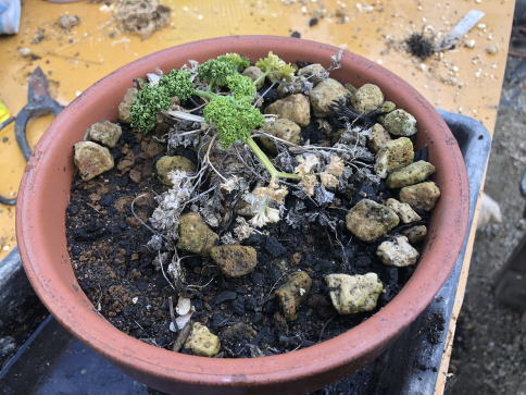 | 1年間収穫したパセリ2鉢です。(1月30日) これを植え替えます。 | ||||