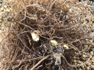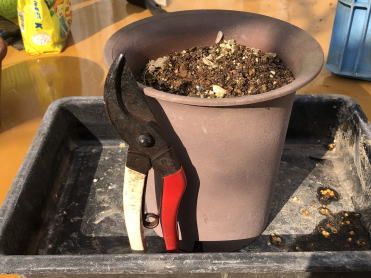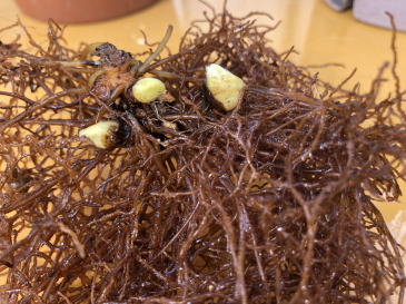| 取り出した根と芽を水で洗い、古い根を切りながら鉢に収まるように少し切りそろえた。 | ||