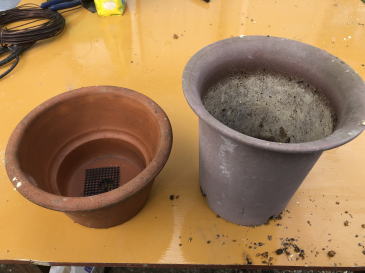 | 右の鉢はこれまで植えていた鉢。左は今回植える鉢。葉姿に比べ根群が小さいので鉢が大きすぎない方が良いと本に書いてあったので中深鉢に変更した。 | ||