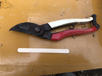 隙間なく用土が入り込むようにアイスクリームの棒みたいなやつ(上画像)で、株元や根の間に棒を使い土を押し込みながら植える。 |