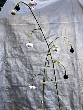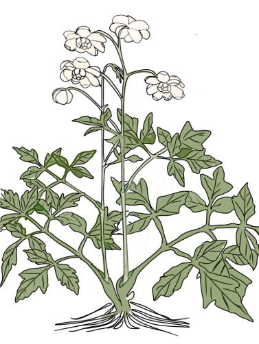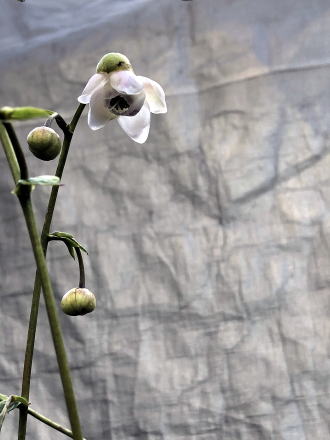日本固有で1属1種の植物。 キンポウゲ科/レンゲショウマ属 夏期に花径が4cmほどの淡紫花が下向きに咲く。春に芽を出し、そのまま葉茎を伸ばして広がる。葉の展開が終わるころから花茎を伸ばす。 左の絵はレンゲショウマの姿。実際の花茎はもっと長いので、葉とのバランスがちょっと違う。(写真) |