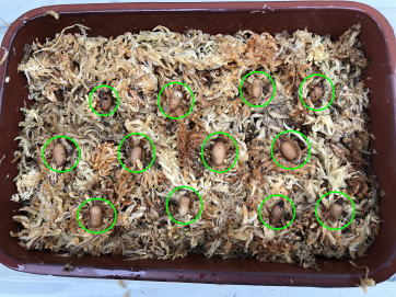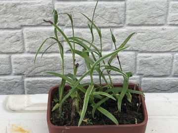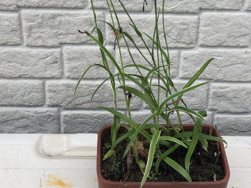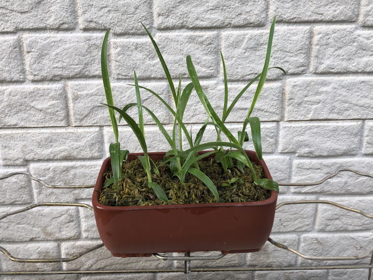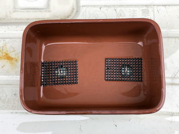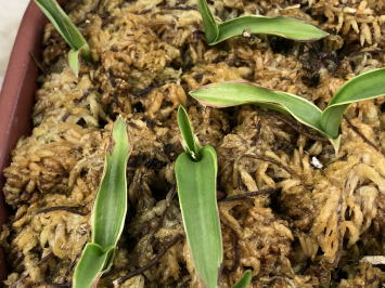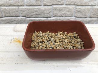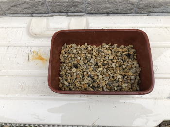 用土は、赤玉土と鹿沼土を混ぜたものや水苔だけなど、いくつか試しました。私の管理方法では水苔が育てやすく、花も良く咲いていました。 今回も水苔で栽培します。 鉢底にはボラ土の小粒を敷き詰めます。 |