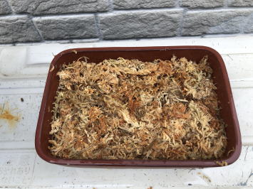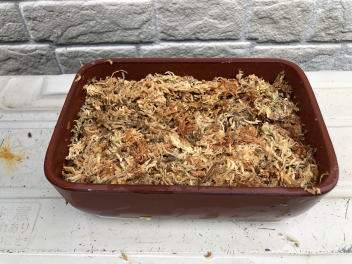 ボラ土の上に、水を十分給水させた水苔をしぼって、鉢の深さの2/3程度敷いていきます。 水苔は成長した株が安定するように、少し硬めに敷き詰めていきます。 (今回は少し厚く敷きすぎました) |