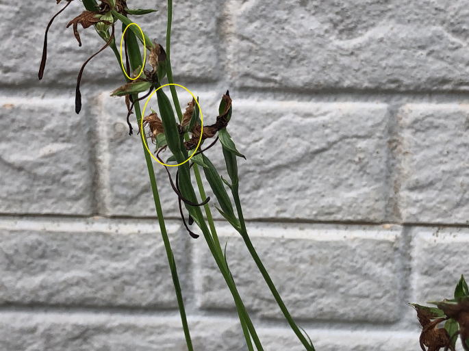 | 9月2日 花が終わった後に花がらを摘むのが遅く、種ができる鞘が成長しています。(黄色の〇部分) 球根の肥大にも影響が出るのですぐに花茎を取り除くことにしました。 |