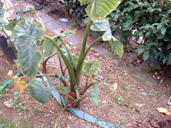 9月以降里芋の葉を、たぶん蛾の幼虫と思われるやつが食べていた。 幼虫は次々あらわれ、手で取り除いたりして苦労しました。 |