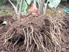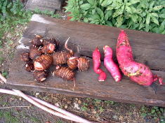 | 根を切って見やすくした状態 | 同日に収穫したサツマイモと | |