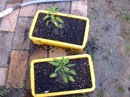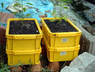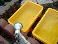 穴の開いていないコンテナには、入るだけの水を入れます。(写真左) 水の入ったコンテナの上に、苗を植えたコンテナをそのまま重ねておきます。 (5月14日) |