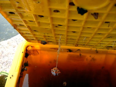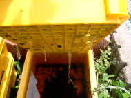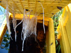 | 6月18日の様子 | 上部のコンテナから根が出、下の水の中に伸びている | ||