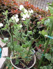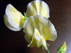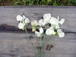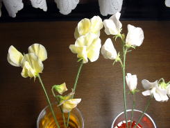 昨年、ホームセンターでスイートピーの苗を購入しました。白い花の苗しかなかったのですが鉢植えにして栽培していました。5月に入り花が咲いたので、切り花として利用しようと考えました。 |