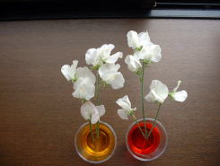 市販されている食用色素を水に溶き、その中にスイートピーを入れておきました。写真左側は、花を入れた直後。花びらは白いままです。写真右側は、花を入れた後約10時間経過した様子です。 黄色の色素に入れた方は黄色くなっているのがわかるでしょうか。 |