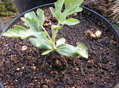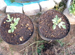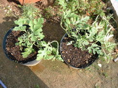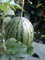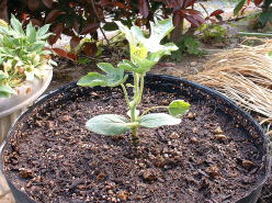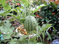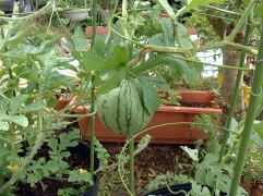| これまで、大型ポットでジャガイモ、芽キャベツ、ゴボウなどつくってきました。今度はスイカに挑戦!品種は’マダーボール’2鉢を使用し栽培をしています。 | ||