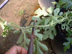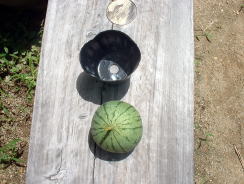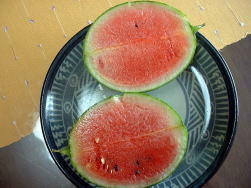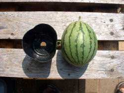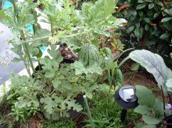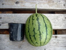 7月12日。しおれてしまった方のスイカの収穫をしました。大きさは、3号ポットと比較してみるとわかりますが、ご覧の通りです。(上写真) 味は、しっかりスイカの味があり、おいしいものでした。夕食時子どもが喜んで食べました。 |