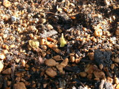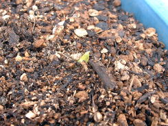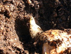 5月28日の様子。 芽が出はじめたので、土を掘って芽の様子を観察しました。 日光にあたっていないので白色です。 |