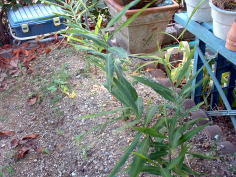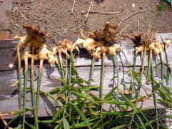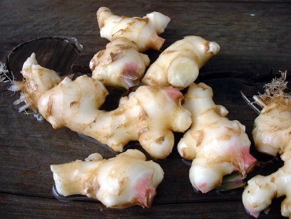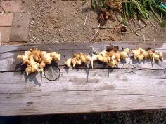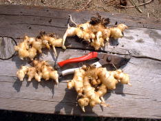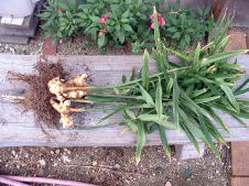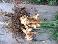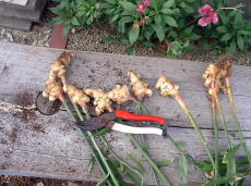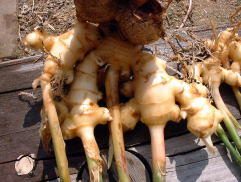 10月9日。1株だけ収穫しました。 収穫して、根を切ったり土を落としたり洗ったりしているうちに生姜を折ってしまいました。できるだけ大きな姿で収穫したかった。 2009年のポット栽培より生姜は大きいような気がします。 収穫したばかりの生姜の香りが非常にすばらしい。 |