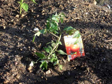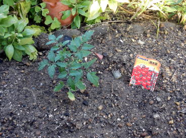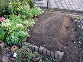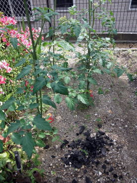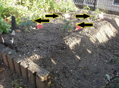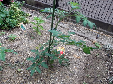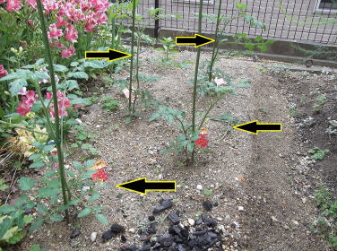 4月24日。 購入した苗を植え付けました。 左画像の矢印部分に苗があります。 手前側2本がミニトマト。 奥2本が中玉トマト。 どちらも接ぎ木苗です。 |