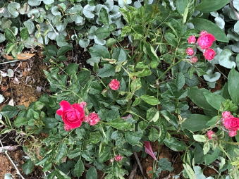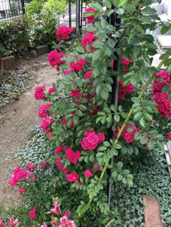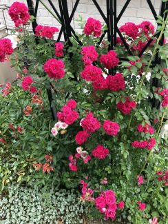 | キングローズの特徴 濃いピンクの小輪八重花がたくさん咲きます。枝が柔らかく仕立てやすく、半日陰でも良く育ちます。3mほど伸びます。花は5月頃咲き、花付きが良いので案外目立ちます。 |